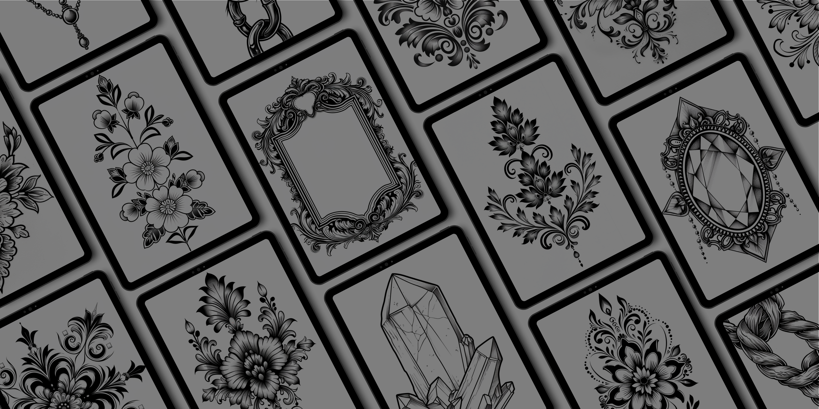 Cada paquete contiene 100 diseños únicos que ofrecen una amplia gama de inspiración para crear hermosos tatuajes ornamentales para sus clientes. Ya sea que esté diseñando una manga completa o una pieza independiente refinada, el Megapaquete Ornamental ofrece infinitas posibilidades para la expresión creativa.