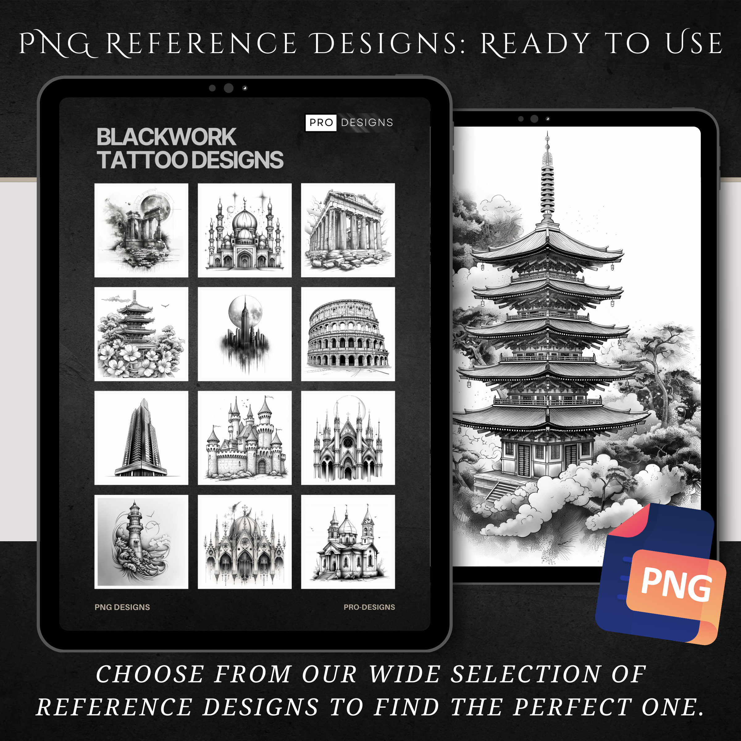 Capture the grandeur and elegance of iconic architecture with the "Blackwork Architectural" tattoo design pack. Featuring 100 meticulously crafted blackwork designs, this collection is perfect for tattoo artists who want to incorporate the beauty of structural art into their work.