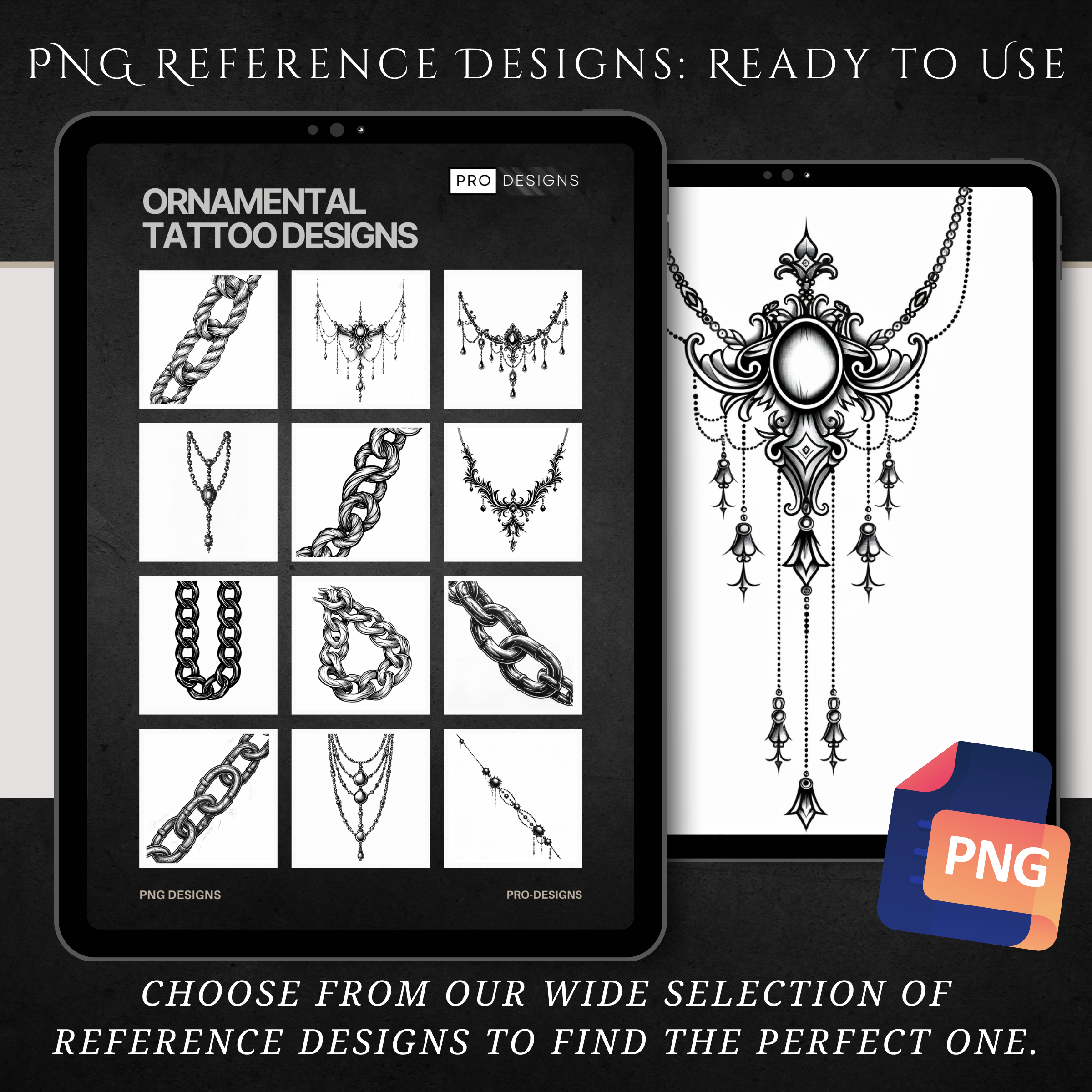 Adorn your tattoo art with the sophistication of the "Ornamental Necklaces & Chains" tattoo design pack. Featuring 100 intricate and detailed designs, this collection is perfect for tattoo artists looking to create luxurious, refined tattoos inspired by the elegance of jewelry and ornamental chains.