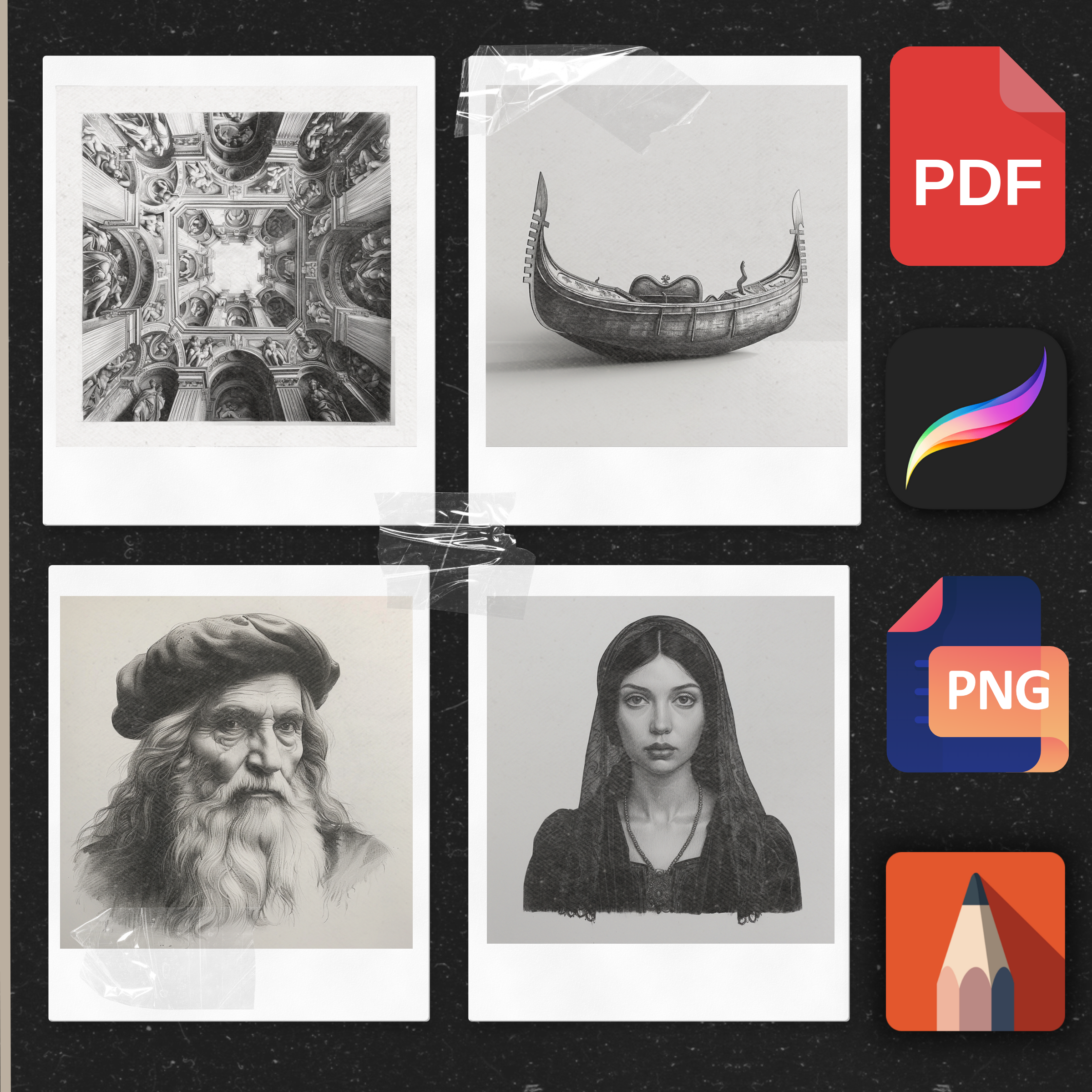 Elegant and Masterful Designs: Each design in this collection reflects the artistic excellence and intricate beauty of the Renaissance period. From classical portraits and architectural wonders to symbolic motifs and decorative flourishes, these designs are perfect for creating art that exudes sophistication and historical charm.