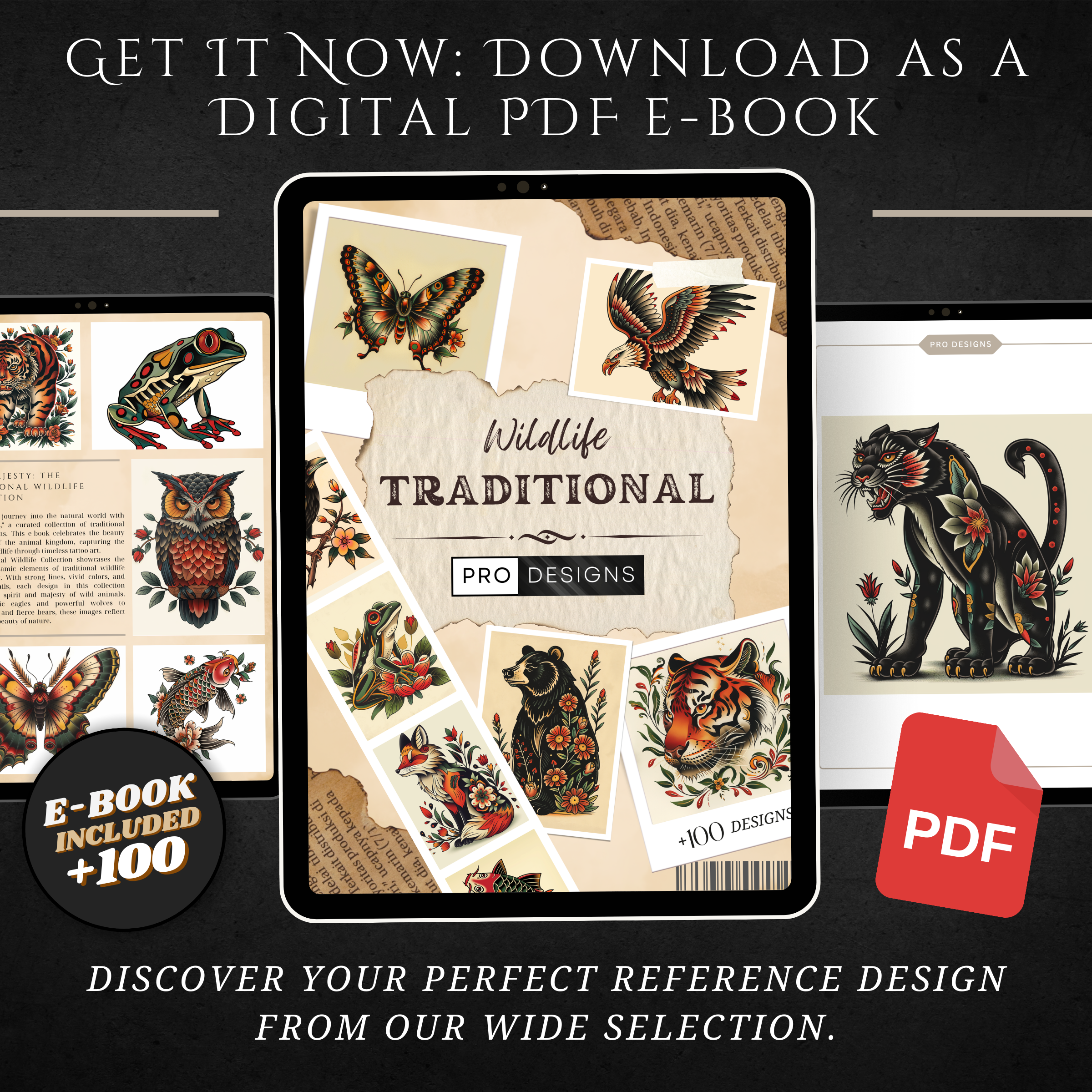 Celebrate the beauty and majesty of the animal kingdom with the "Traditional Wildlife" tattoo design pack. Featuring 100 bold and dynamic designs, this collection offers tattoo artists a range of wildlife motifs, perfect for creating striking and timeless animal-themed tattoos.